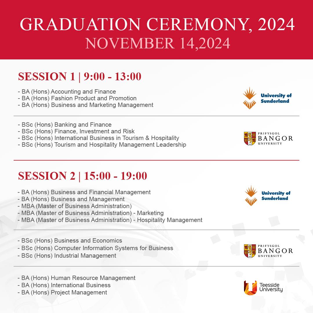 * (please pick up your graduation gowns on November 12, 2024, starting from 14:15 p.m. till 17:30 p.m. and November 13, 2024 starting from 10:00 a.m. till 12:30 p.m. in the room near Conference Hall, A Block, MDIST Campus. Passport is needed)