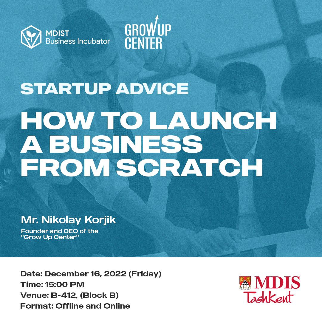 MDIS Tashkent Business Incubation Centre is pleased to invite you to the STARTUP ADVICE with Mr. Nikolay Korjik, Founder and CEO of the "Grow Up Center" (https://www.growupcenter.com/), the International Training Centre